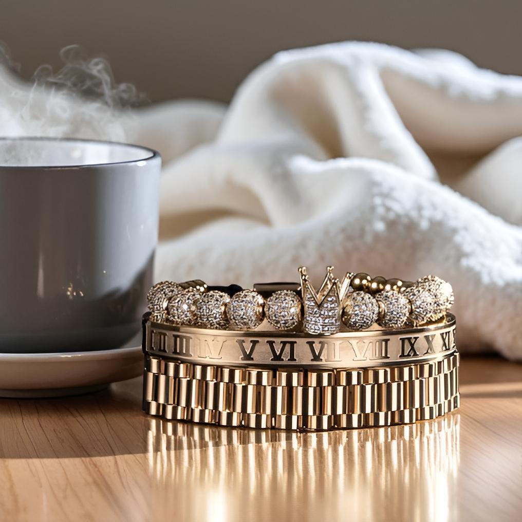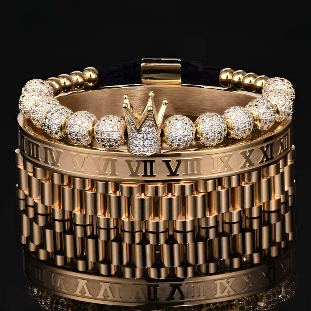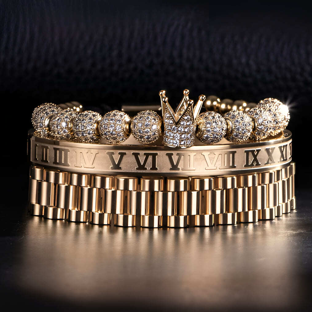 Spüre die Energie des Bizon – Symbol für Stärke, Durchhaltevermögen und souveräne Gelassenheit. Jedes Detail dieses Armband Sets trägt die Dynamik eines Mannes, der sich selbst erschafft. Drei perfekt abgestimmte Armbänder vereinen Luxus, Kraft und Stil. Feinster Edelstahl, edle Zirkonia-Steine und das ikonische Kronenmotiv verleihen diesem Set eine Aura von Macht und Ruhm.